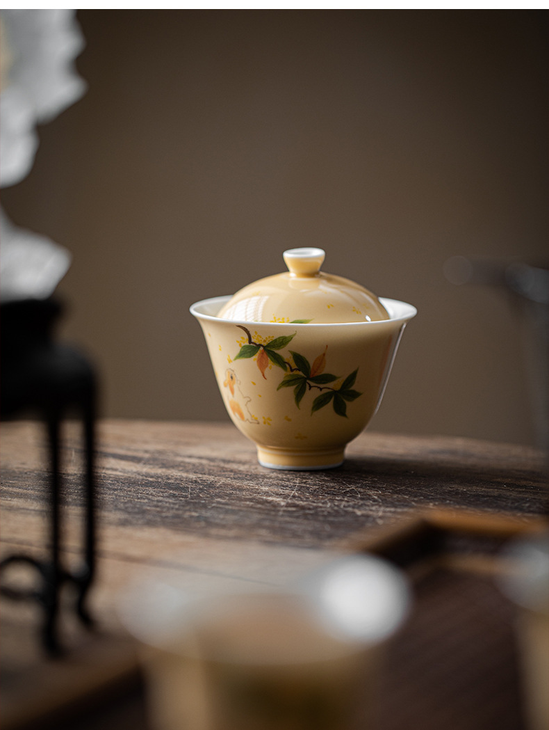 2. **Hand-Painted Osmanthus and Rabbits:** Each gaiwan is individually hand-painted by skilled artisans, with osmanthus and rabbit patterns symbolizing auspiciousness and harmony, adding a touch of nature and liveliness to your tea set.