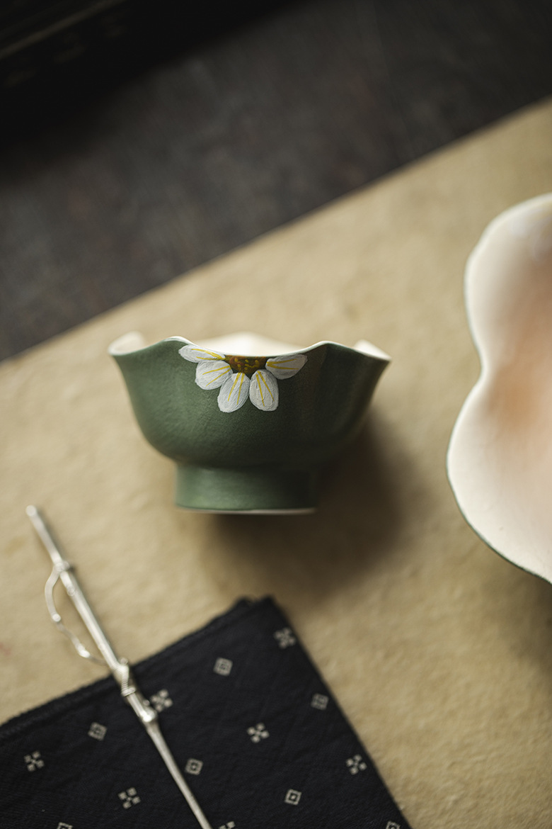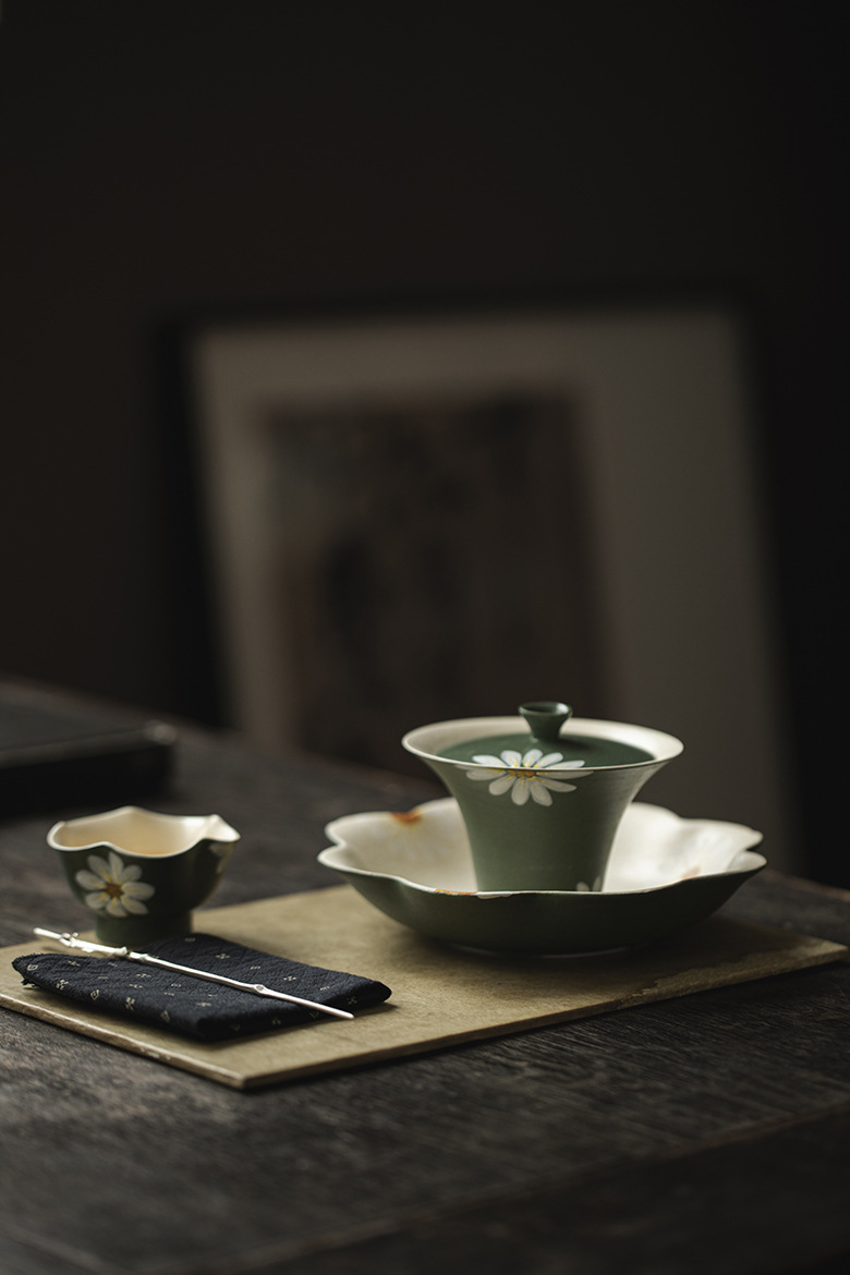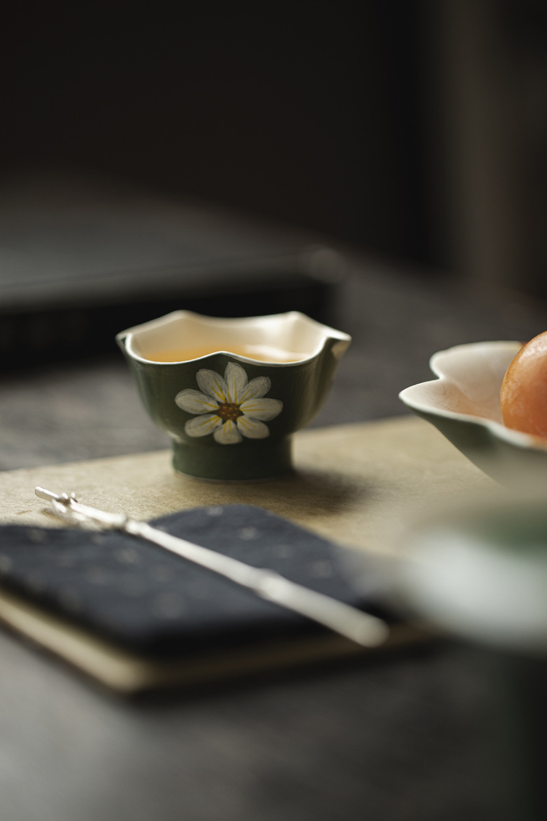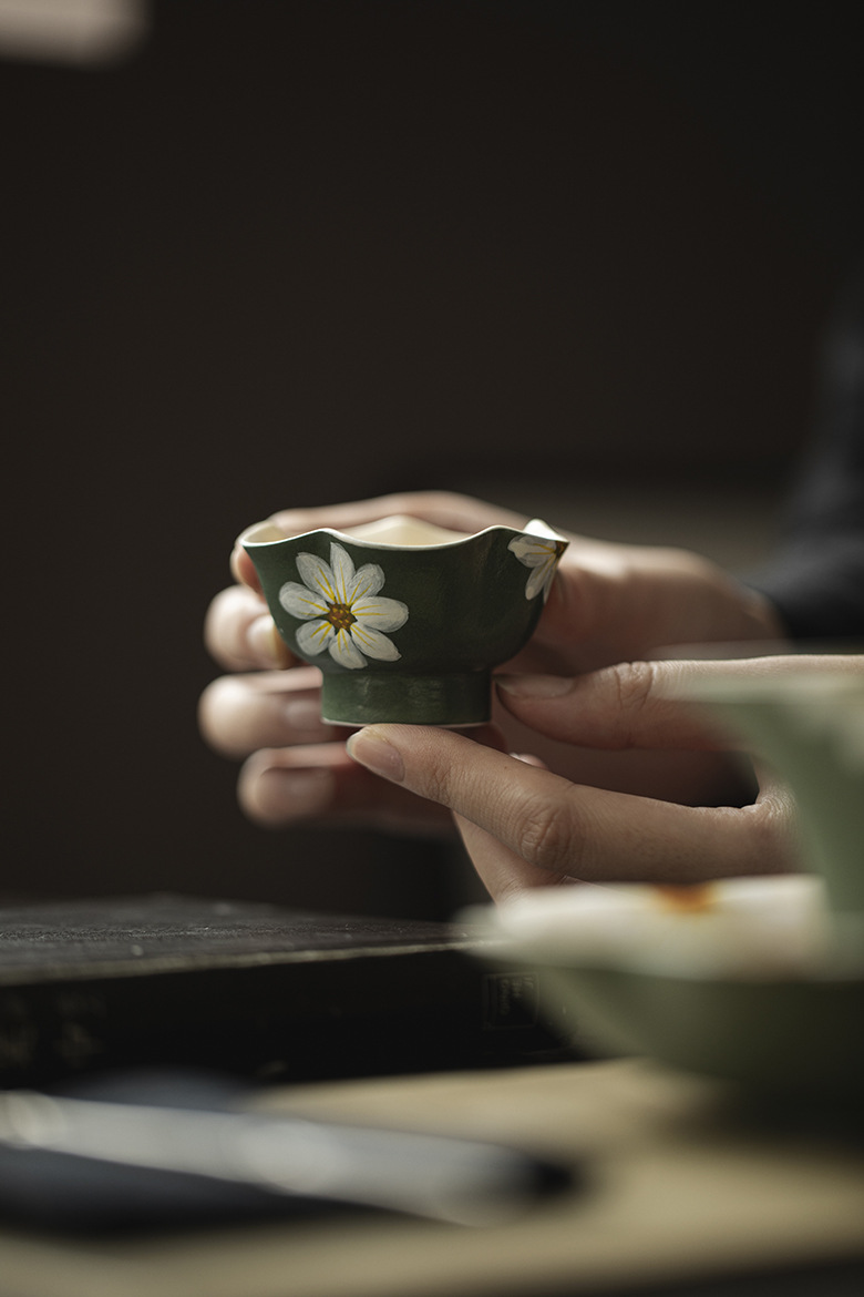 Silent Wind Vintage Dark Green Powder Citation Hand-Painted Daisy 35ml teacup