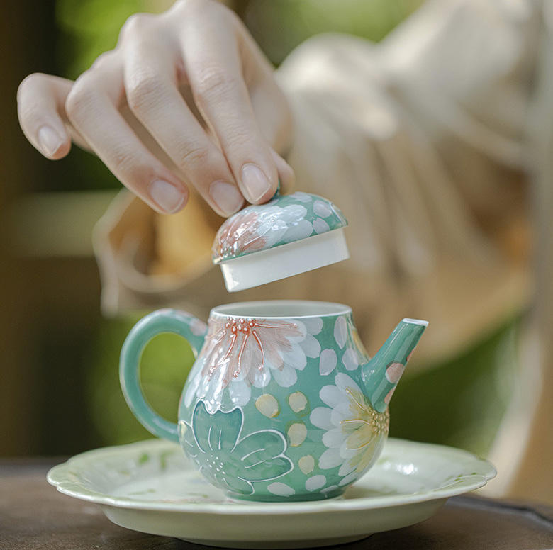1.Unveiling the Delights of Loose Leaf Tea in an Exquisite Arita-yaki Turquoise Green Stacked White Hand-Painted Layered Flower Autumn Teapot Are you ready to leave behind the monotony of tea bags and delve into the rich tapestry of loose leaf tea? This Arita-yaki Turquoise Green Stacked White Hand-Painted Layered Flower Autumn Teapot will usher you into an entirely new realm of tea appreciation. Crafted by skilled artisans, its intricate hand-painted designs will engage your senses and enhance your tea-drinking experience.