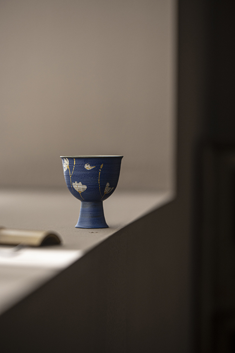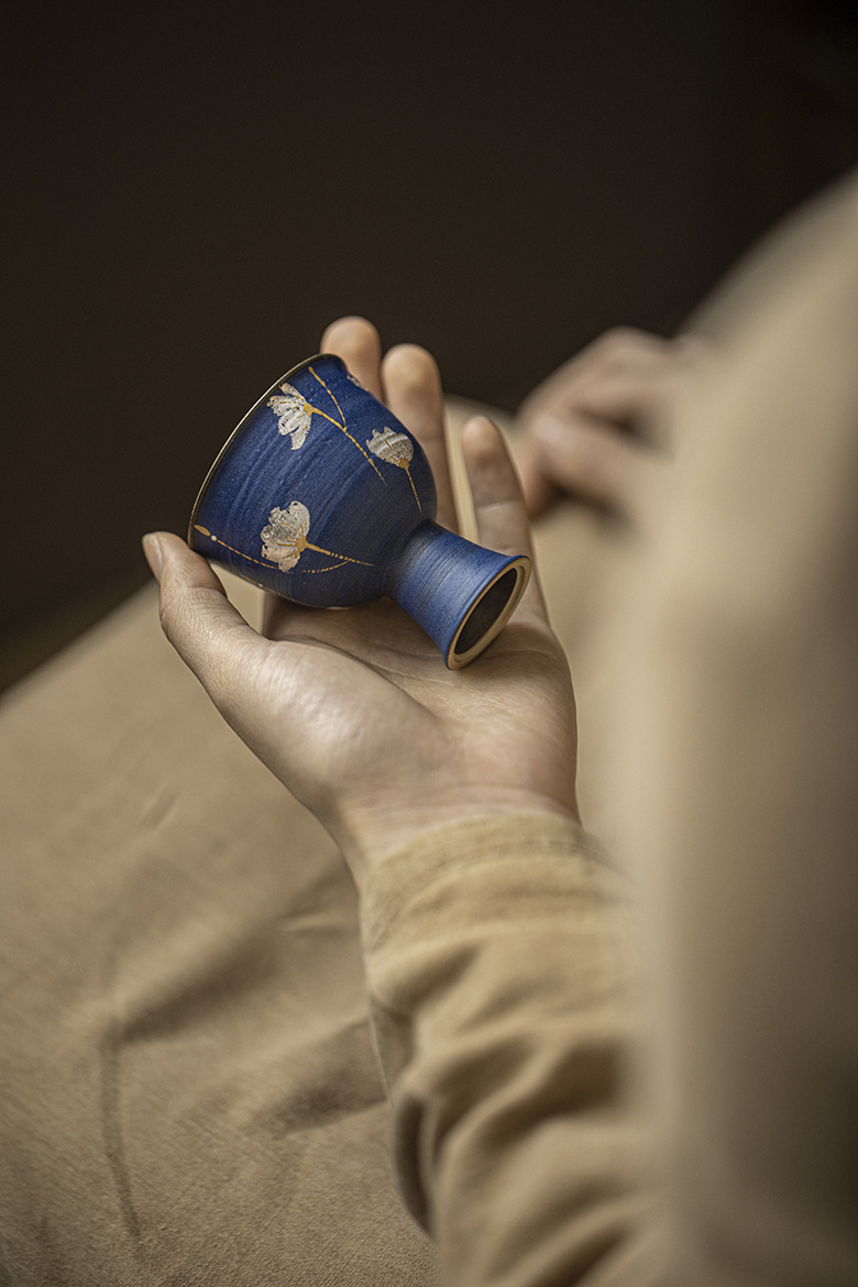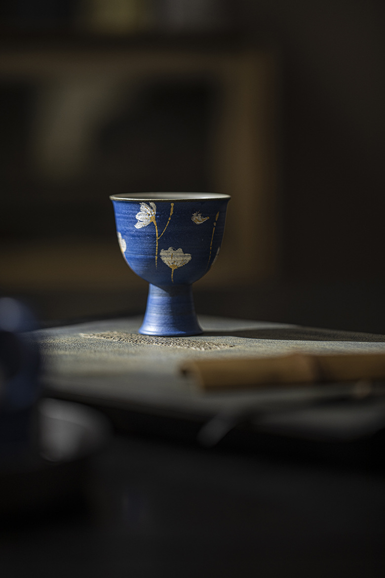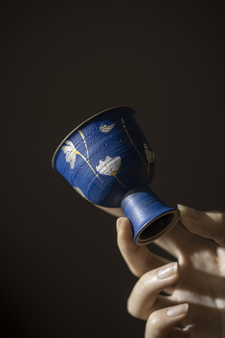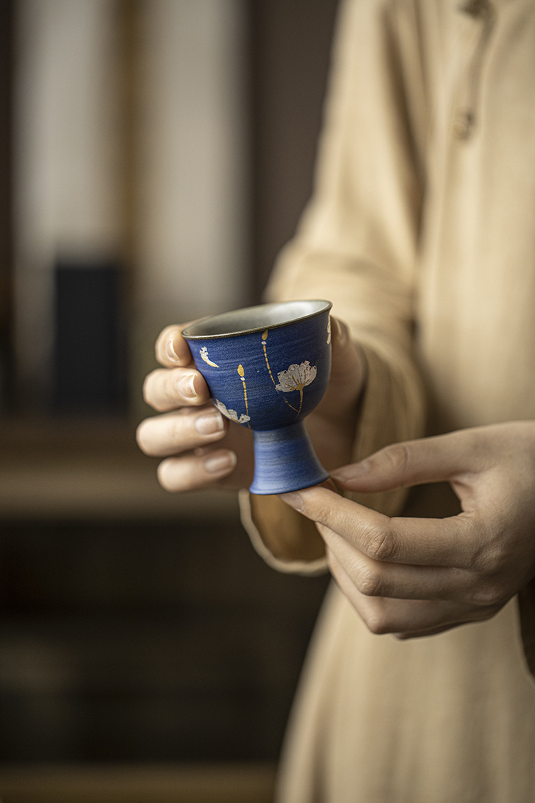 the Klein Blue and Pink Hand-Painted Ceramic Tea Cup - A Tribute to the Song Dynasty's High-Footed Cup, 55ml
